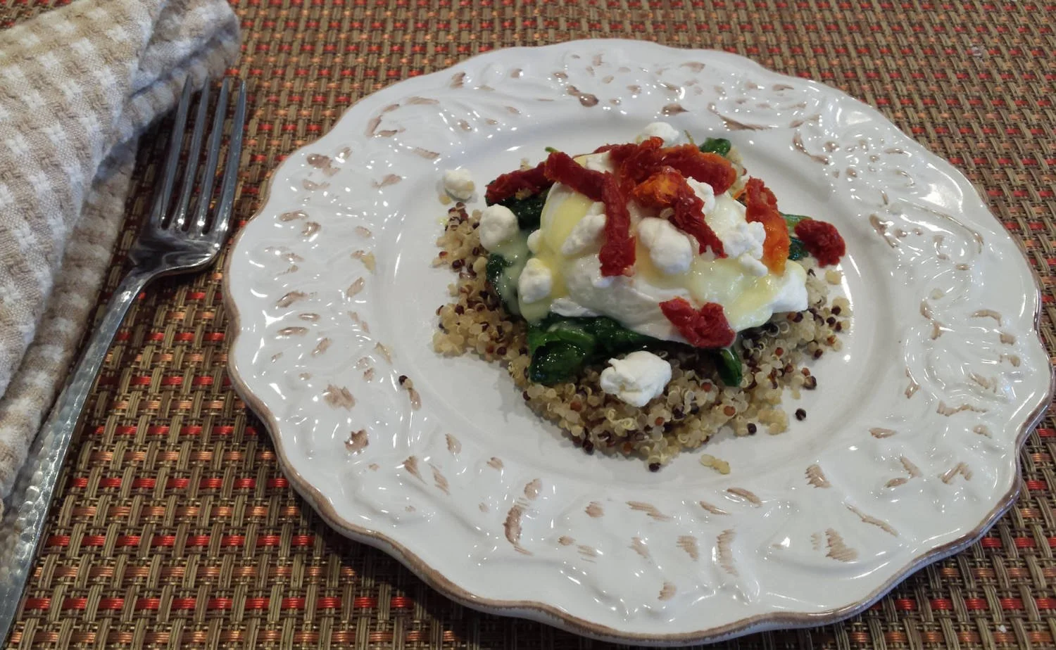 In my typical fashion, I wanted to replicate it when we got to the next campground. Jim was making Eggs Benedict so I figured we could mix the two recipes and see what came out of it!. Lacking the Sunflower toast, I substituted quinoa as a base. Then kept the sautéed greens and goat cheese, then added sun-dried tomatoes and a drizzle of hollandaise sauce. The result was excellent. When camping we don't make our own hollandaise but you certainly can if you prefer. Try it and see what you think. I know you creative, cheffy-types will amend it beautifully!